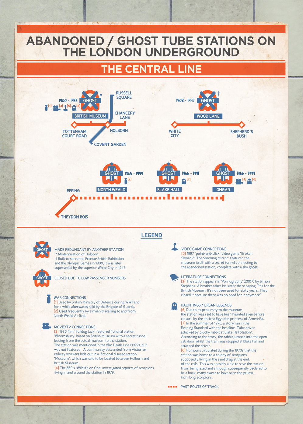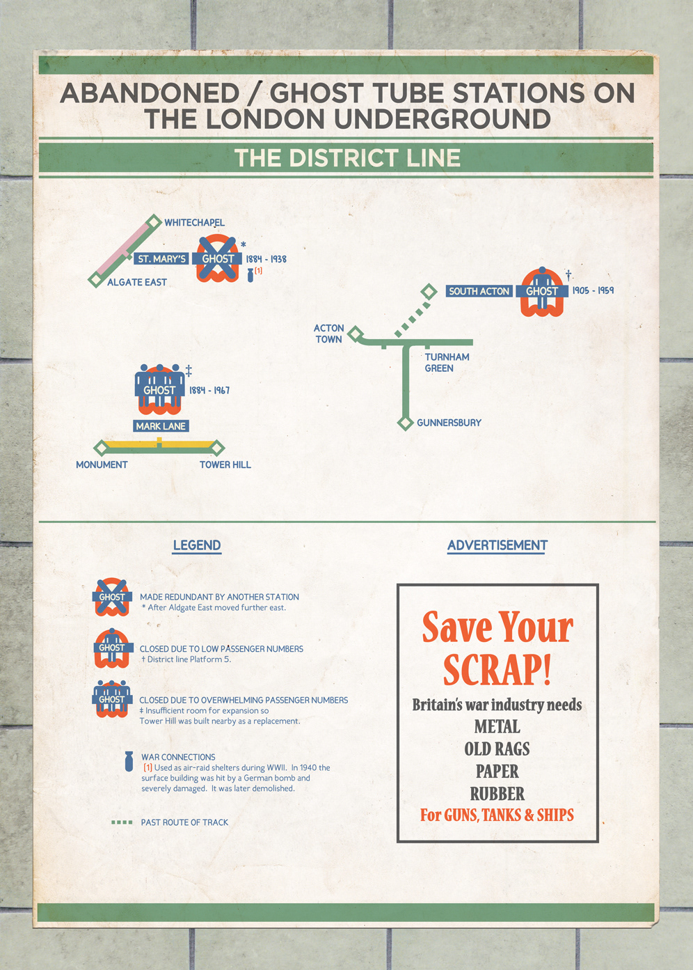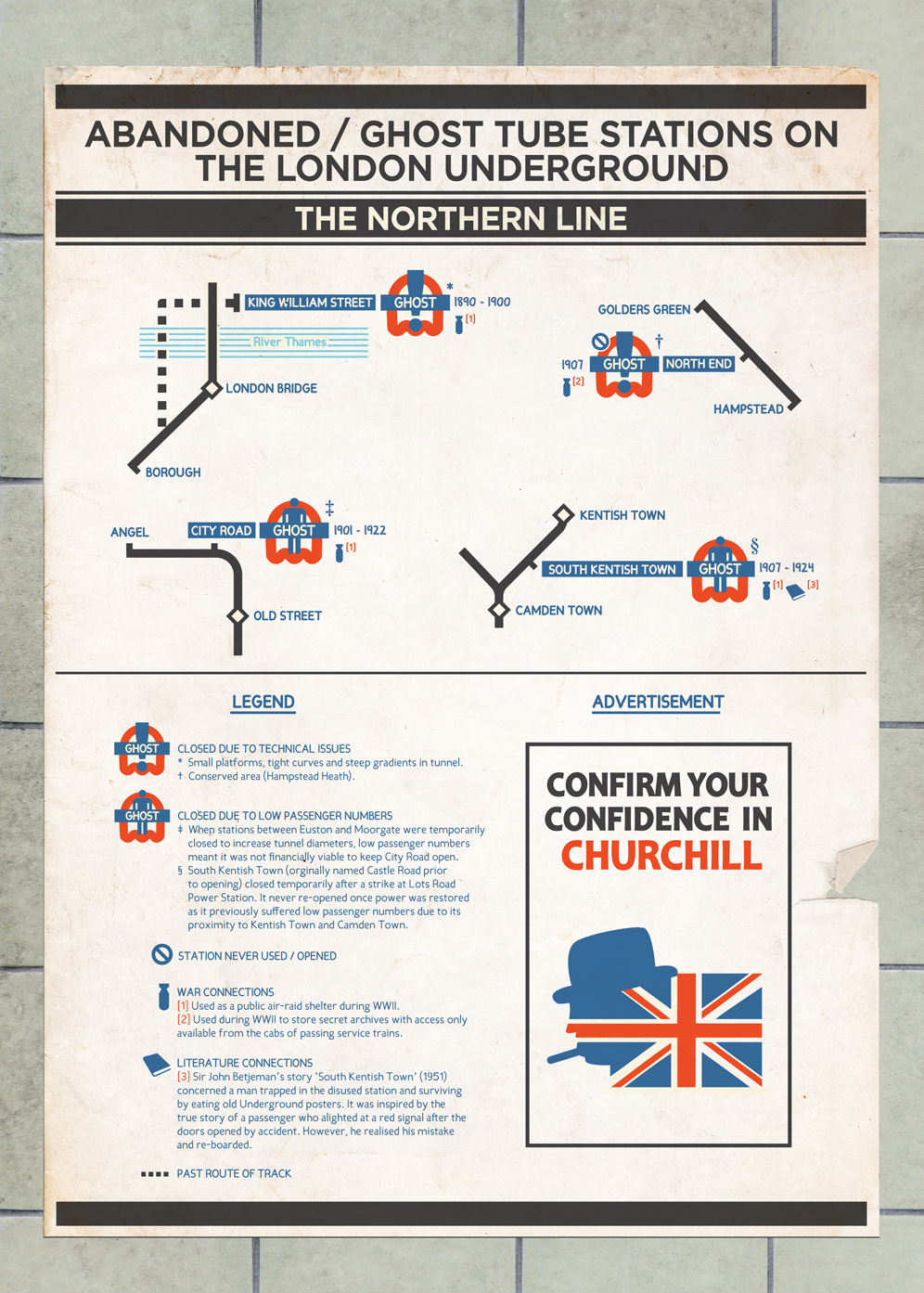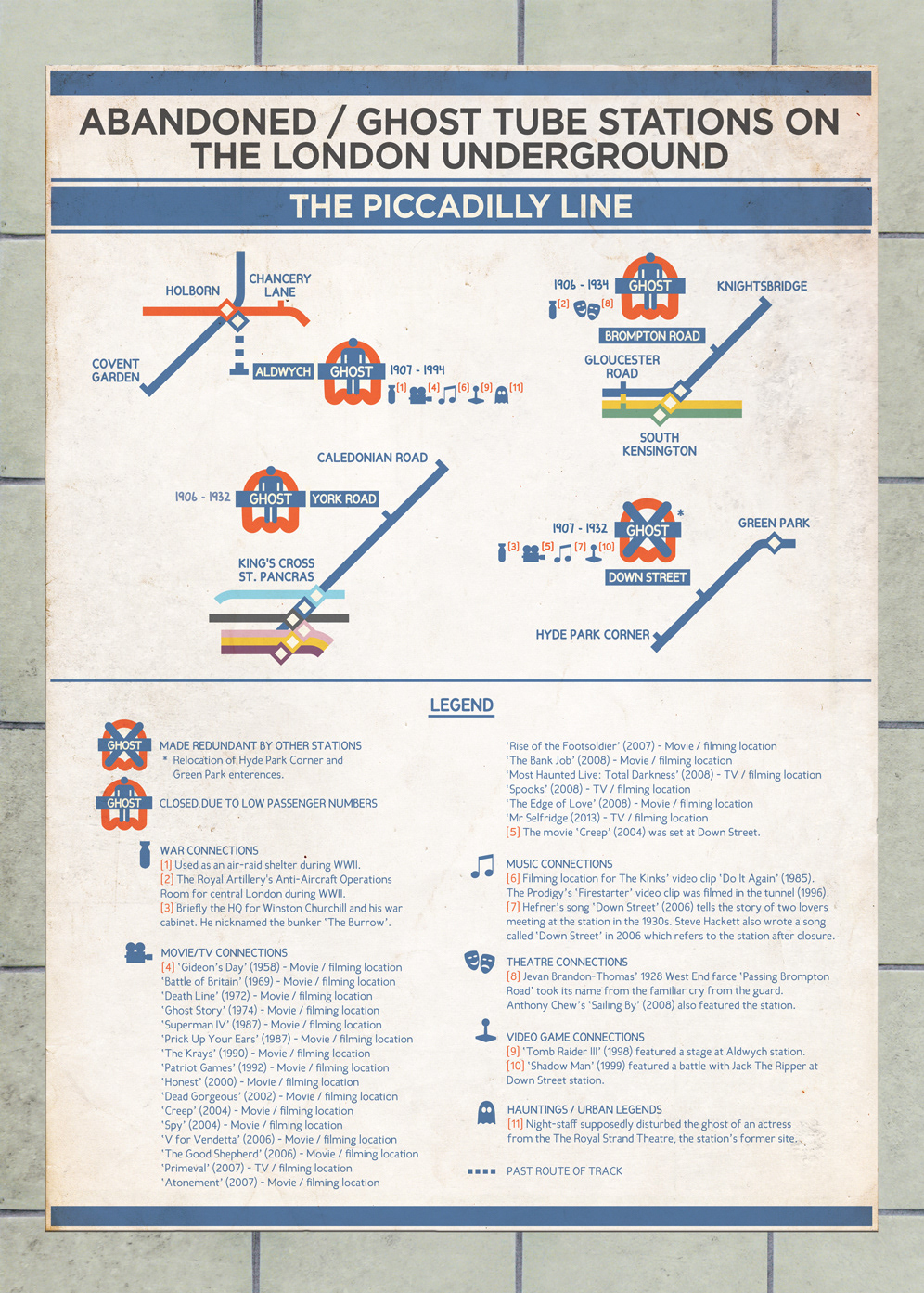 The Abandoned/Ghost station project captures those mysterious stations throughout London which are long closed and disused. Many remain fairly intact and some even feature time capsule-like qualities, such as WWII propaganda posters hanging from the platform walls.