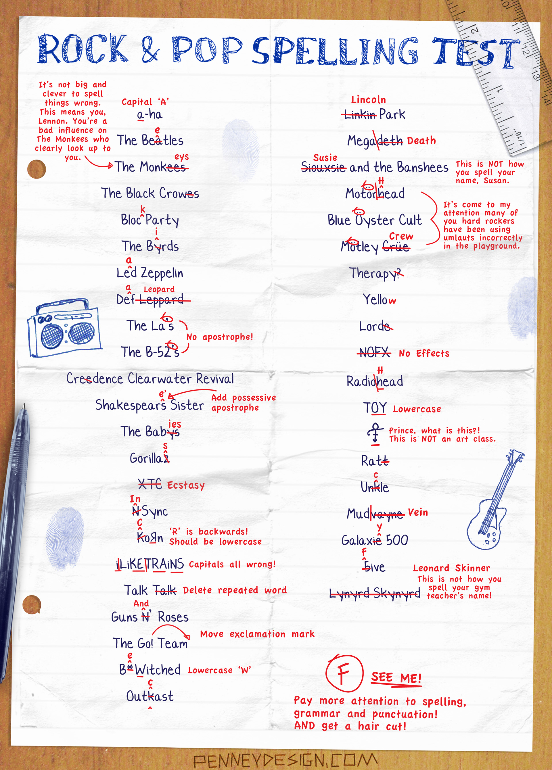 Pointing the finger at bands with wrong (or rather, alternate) spellings in their names. Watch those apostrophes!