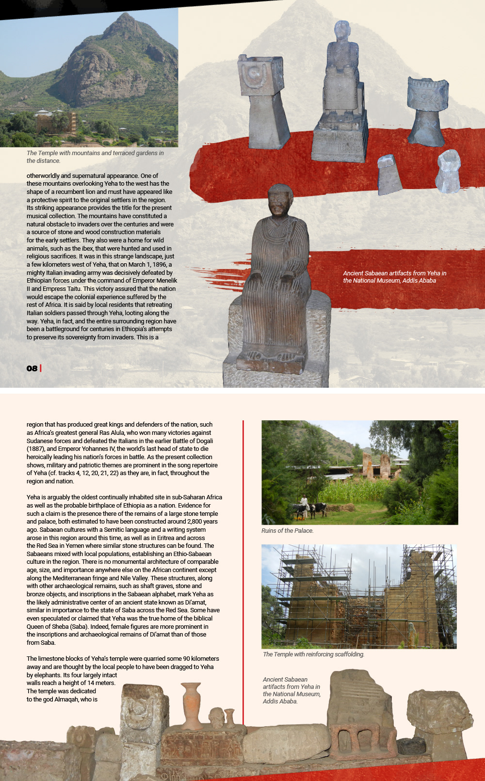 Cover art and booklet design for From The Lion Mountain: Traditional Music of Yeha, Ethiopia. The release is by Dust-To-Digital in partnership with the University of Memphis and its High Water Recording Company who supported the creation of these recordings. The book provides an account of the cultural and musical history of the region along with photographs and annotations for each track by musicologist/field recorder David Evans.