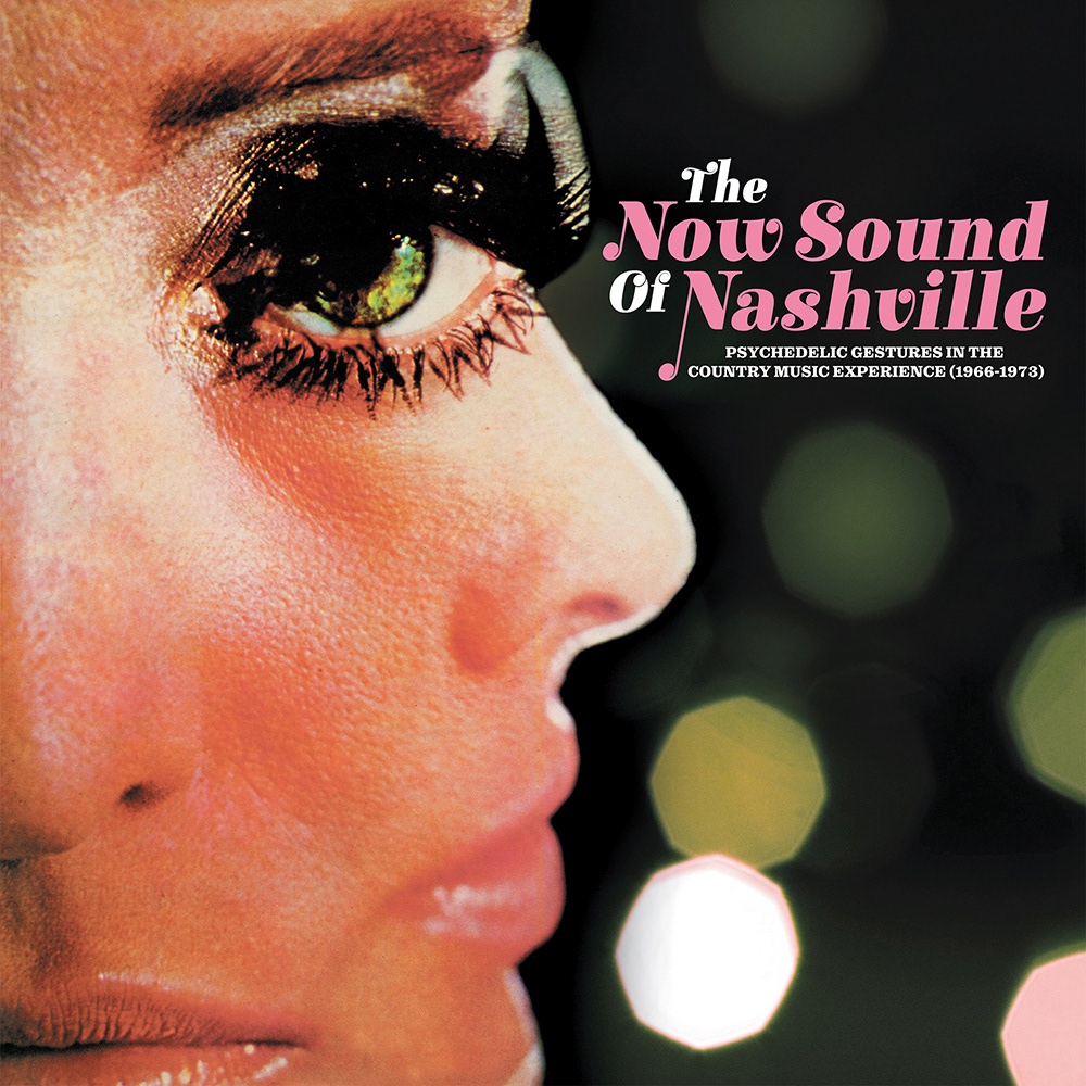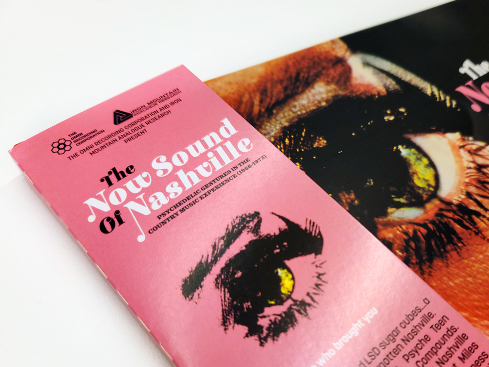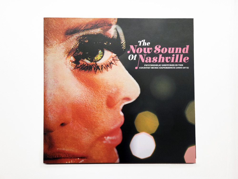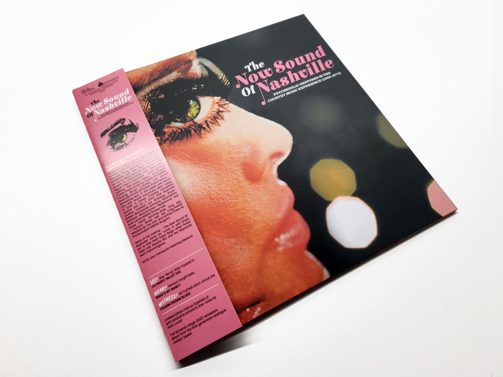 LP artwork for The Now Sound Of Nashville: Psychedelic Gestures In The Country Music Experience (1966-1973). The golden age of country music in Nashville in terms of psychedelic music. Limited gatefold pink vinyl LP with obi-strip.