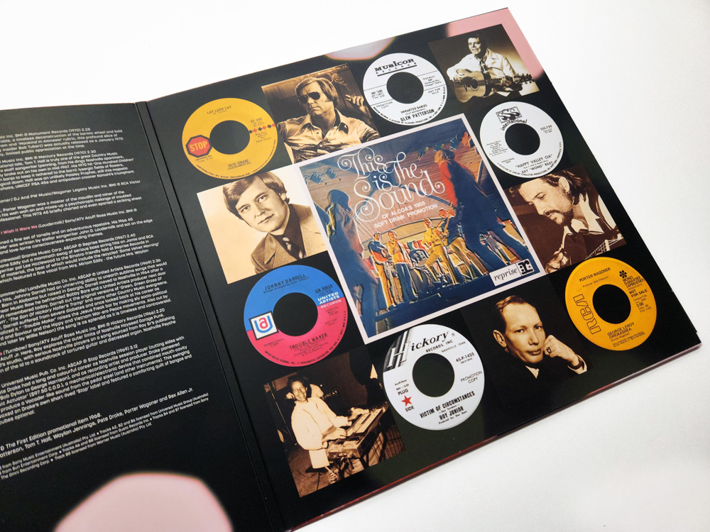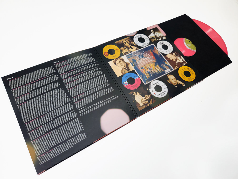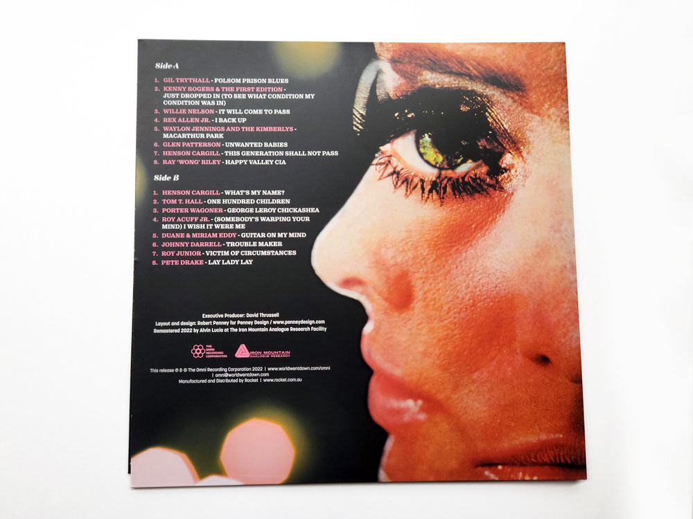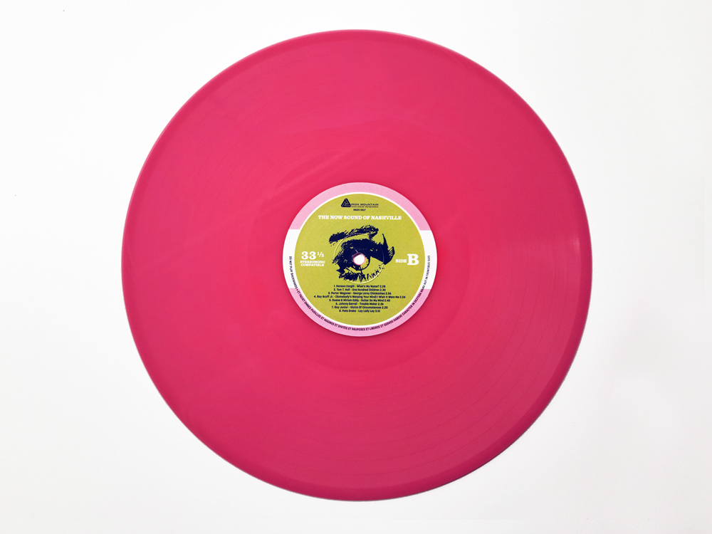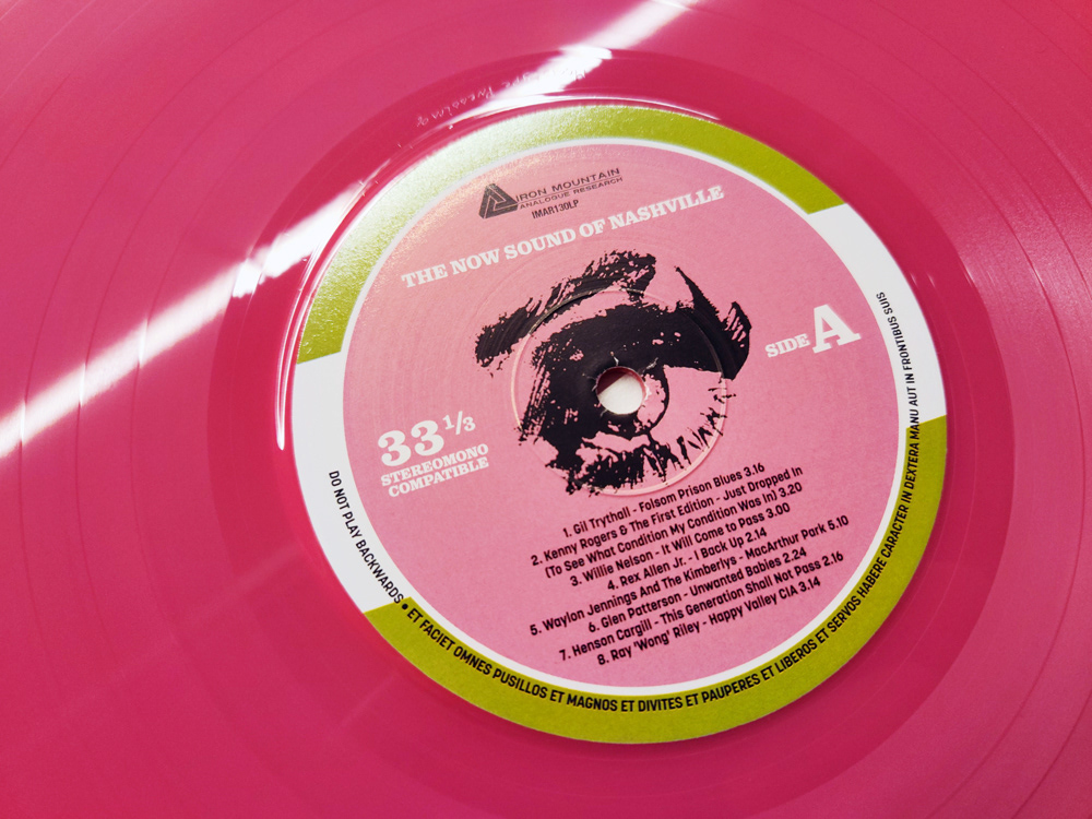 LP artwork for The Now Sound Of Nashville: Psychedelic Gestures In The Country Music Experience (1966-1973). The golden age of country music in Nashville in terms of psychedelic music. Limited gatefold pink vinyl LP with obi-strip.